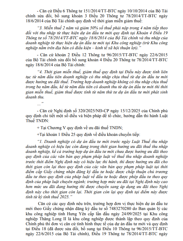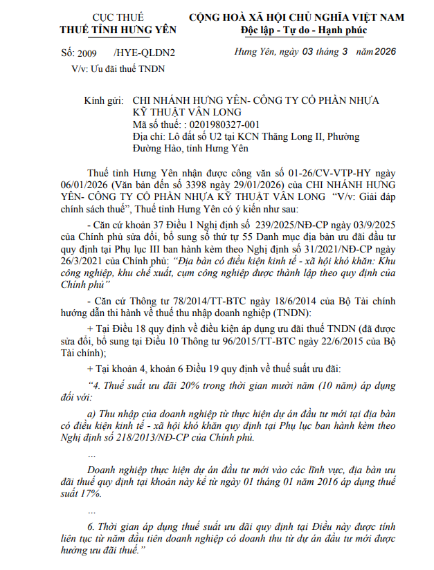 Công văn 2009/HYE-QLDN2 ngày 03/3/2026 của Thuế tỉnh Hưng Yên về Ưu đãi thuế TNDN dự án đầu tư mới trong Khu công nghiệp