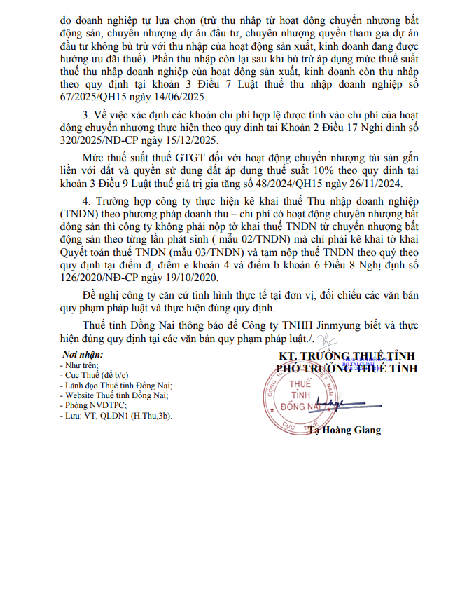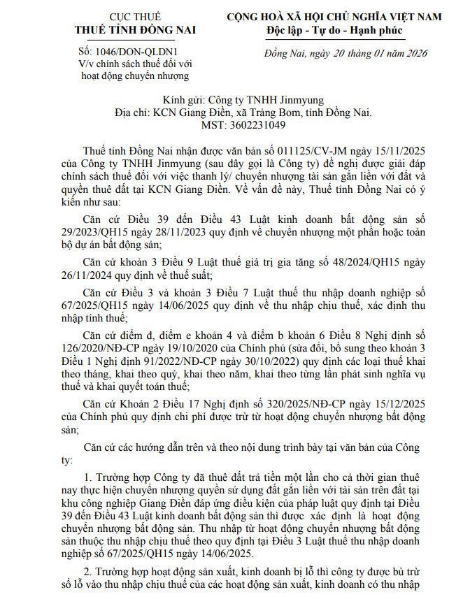 Công văn 1046/DON-QLDN1 ngày 20/01/2026 của Thuế tỉnh Đồng Nai đối với việc thanh lý, chuyển nhượng tài sản gắn liền với đất và quyền thuê đất
