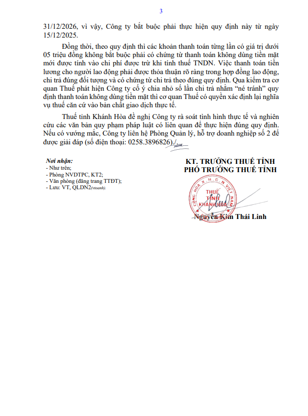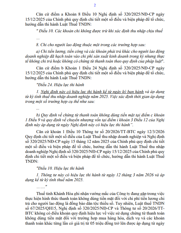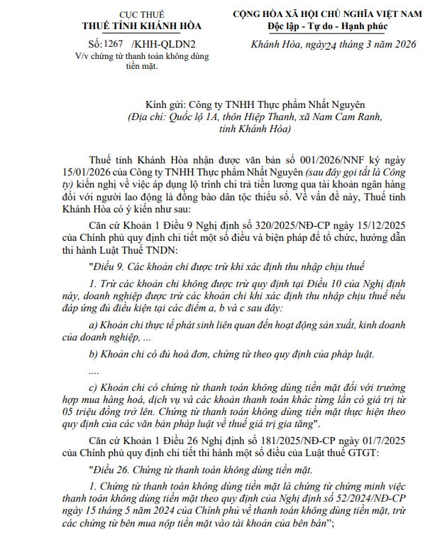 Công văn 1267/KHH-QLDN2 ngày 24/3/2026 của Thuế tỉnh Khánh Hòa trả lời trả tiền lương qua tài khoản ngân hàng đối với người lao động là đồng bào dân tộc thiểu số