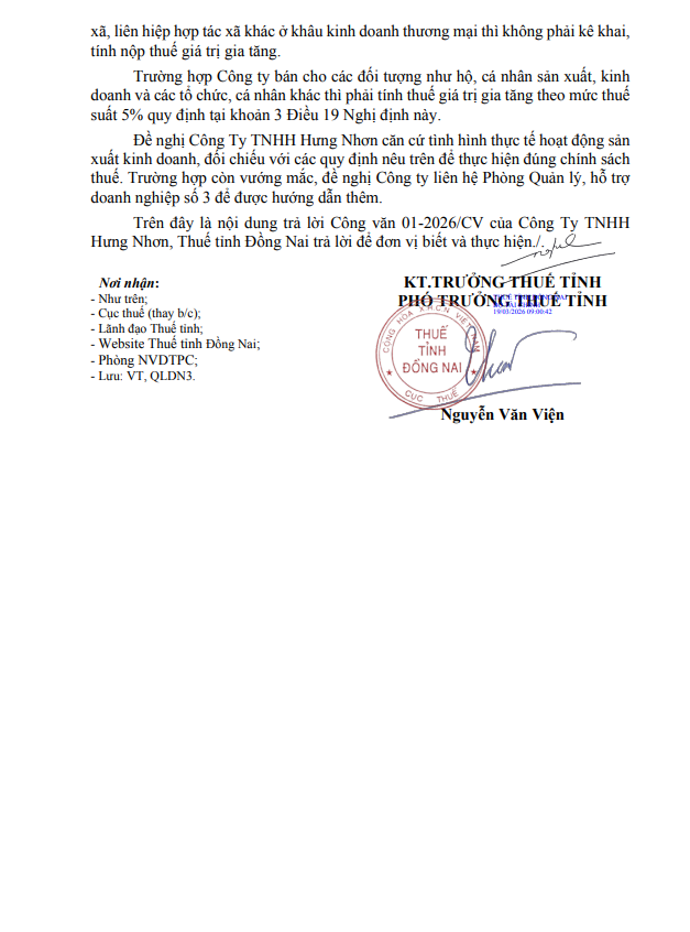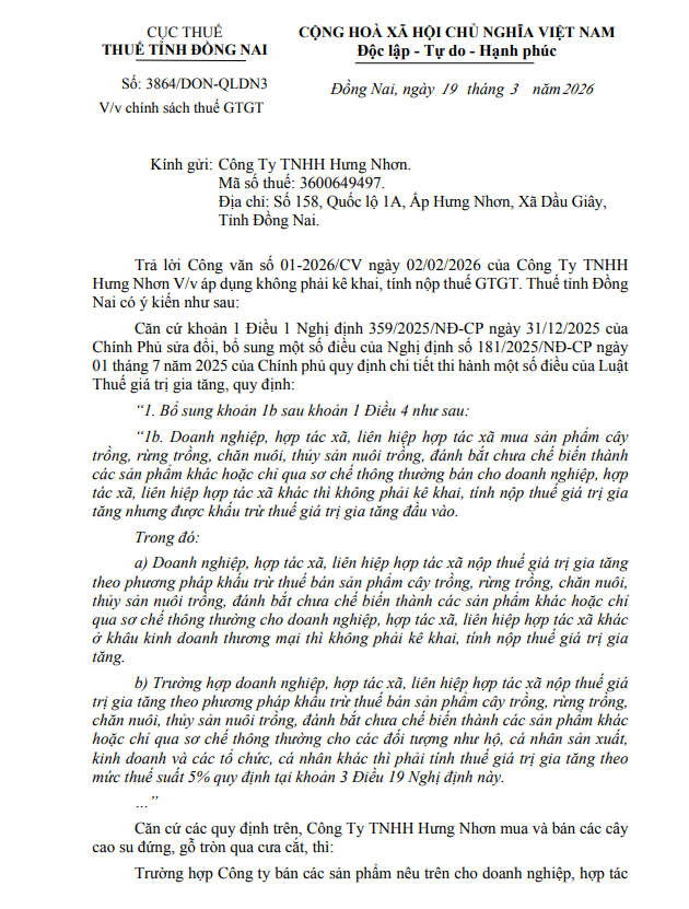 Công văn 3864/DON-QLDN3 ngày 19 /3/2026 của Thuế tỉnh Đồng Nai hướng dẫn kê khai thuế GTGT khi mua và bán các cây cao su đứng, gỗ tròn qua cưa cắt