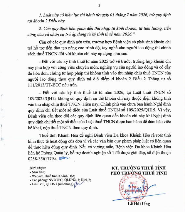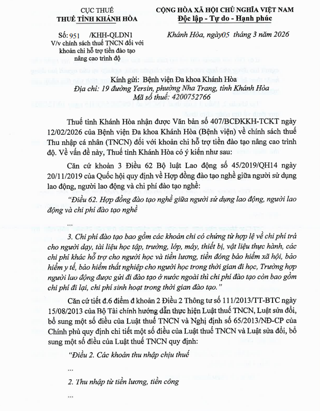 Công văn 951/KHH-QLDN1 ngày 05/3/2026 của Thuế tỉnh Khánh Hòa về chính sách thuế TNCN đối với khoản chi hỗ trợ tiền đào tạo nâng cao trình độ