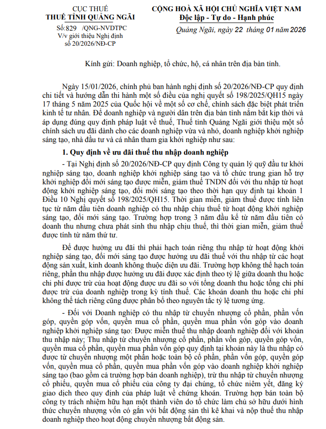 Công văn số 829/QNG-NVDTPC ngày 22/01/2026 của Thuế tỉnh Quảng Ngãi về việc giới thiệu Nghị định số 20/2026/NĐ-CP về một số cơ chế, chính sách đặc biệt phát triển kinh tế tư nhân